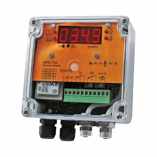 It allows continuous measurement of pressure at both ends of the valve. It is equipped with a microprocessor that facilitates its programming. Both relays, hysteresis and timer can be programmed according to the customer’s needs.